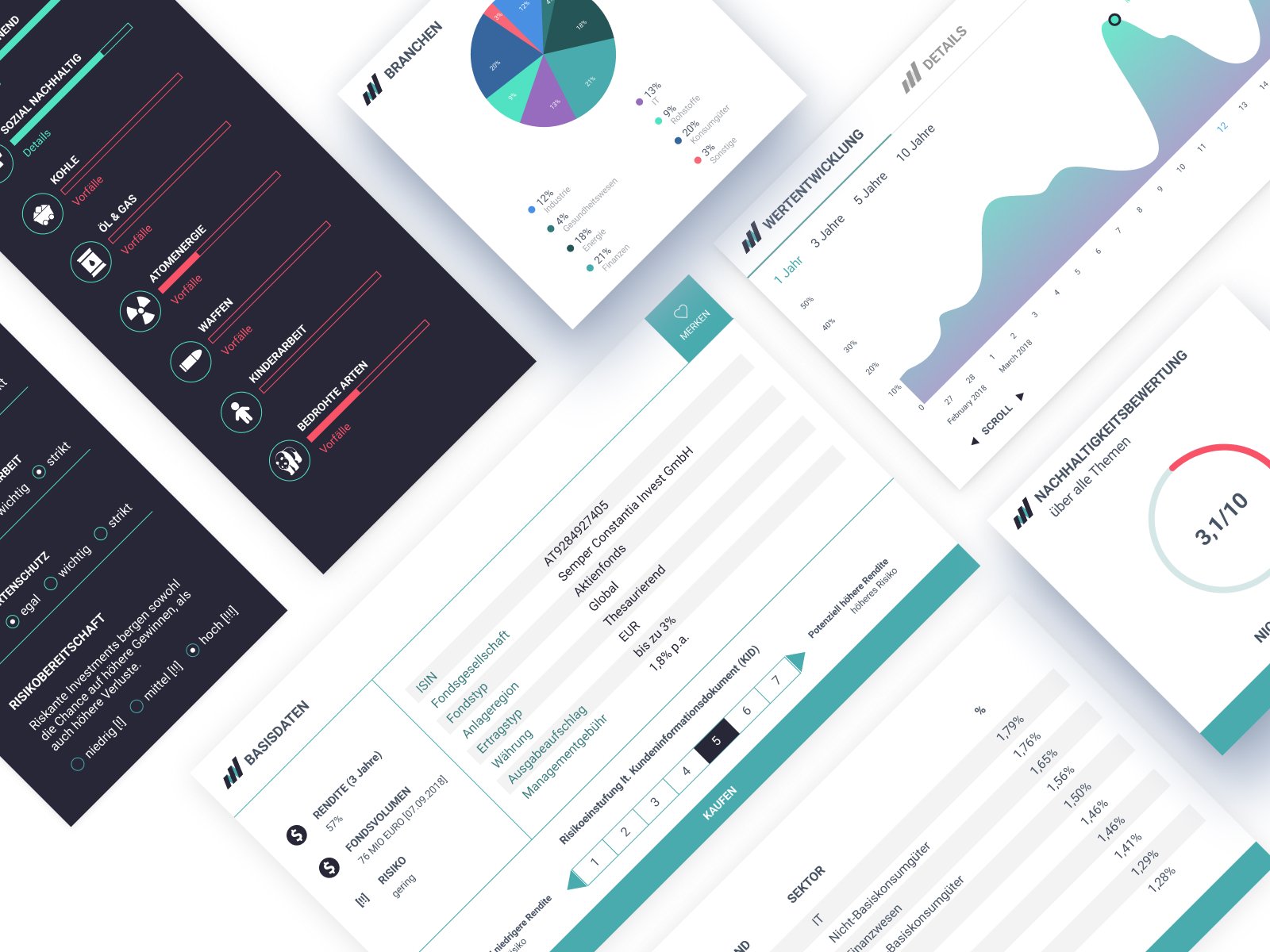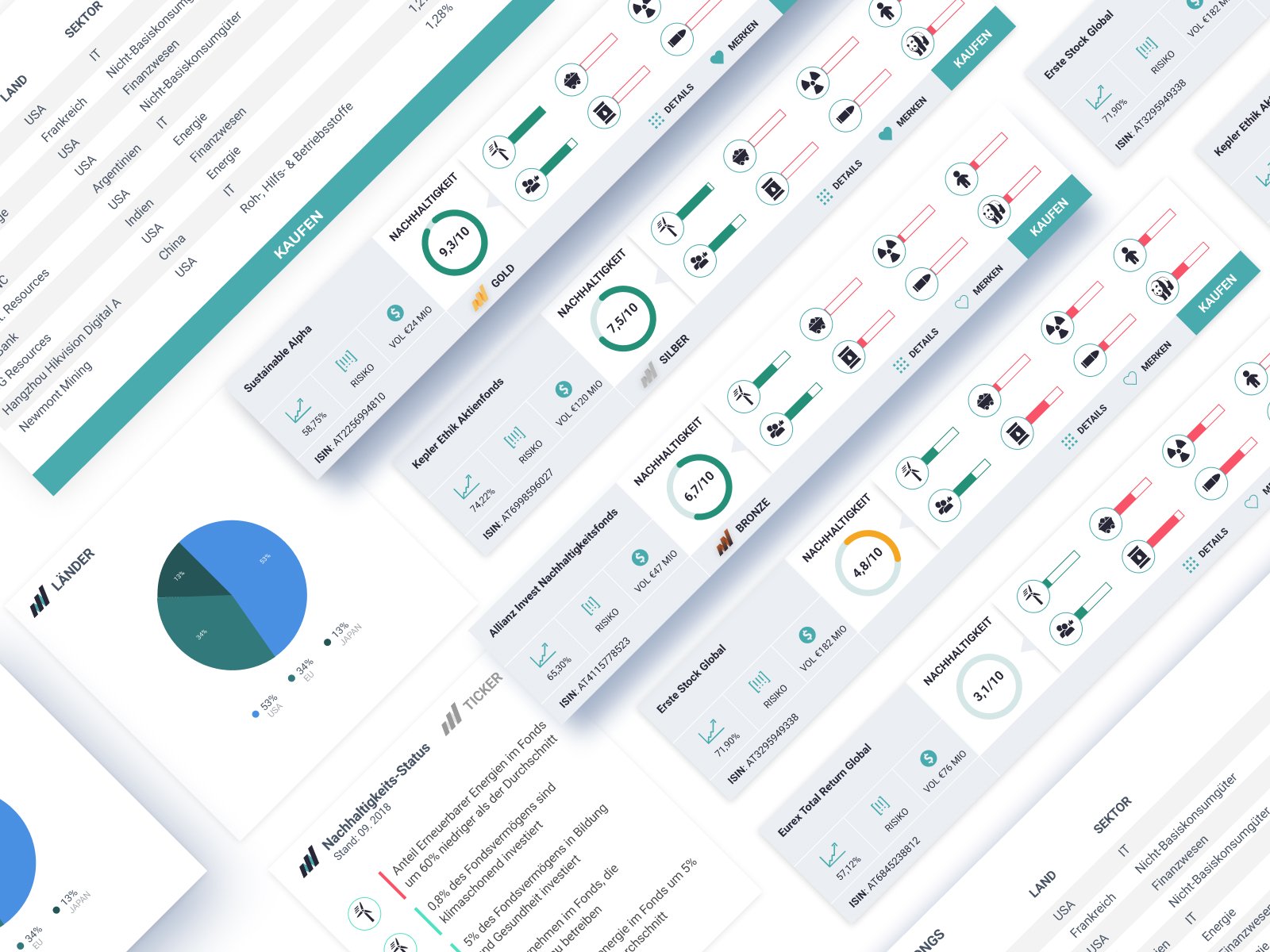 The data I got was only provided in excel tables and coming up with wireframes does not show how you can present data in a user appealing way. So the reason for high fidelity designs was really showing that you can make beautiful styled elements such as cards which provide the same amount of information like an excel sheet but in a much more readable and understandable way. Especially if you are not familiar with this kind of information an excel sheet would not really convince someone to invest in green funds or to transport the message that this topic matters.